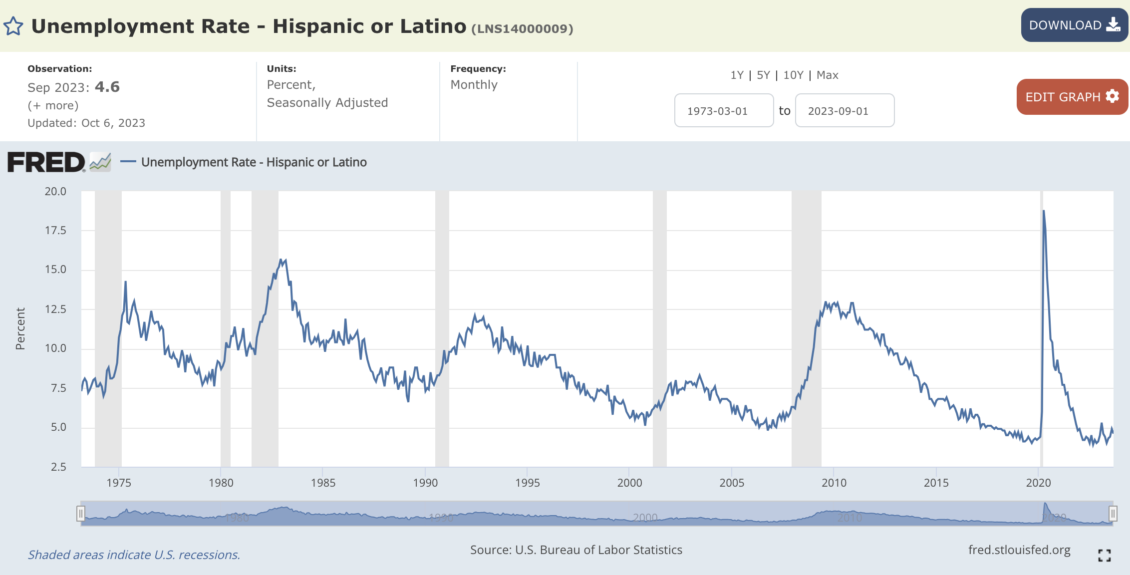 La tasa de desempleo entre hispanos para septiembre de 2023 (4.6%) era superior a la tasa general de desempleo (3.8%), y a la tasa de desempleo entre comunidades blancas (3.4%) y comunidades asiáticas (2.8%). La cifra sólo es superada por el índice de desempleo en comunidades negras (5.7%).