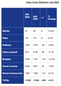 Aunque en julio de 2024 se registró un aumento en las cifras de homicidios (15.8%) y violaciones (6.3%) comparado con julio de 2023, la NYPD informó que la cifra total de homicidios registrados desde el 1 de enero de 2024 al 31 de julio de 2024, es un 10.2% menor que la registrada entre el 1 de enero de 2023 y el 31 de julio de 2023.
