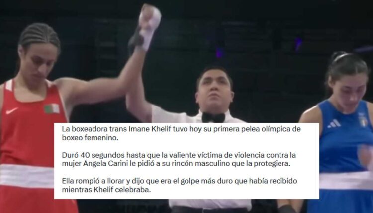 “Angela Carini (azul) abandona su pelea contra el trans Imane Khelif (un hombre biológico) en los Juegos Olímpicos. La ‘pelea’ duró menos de un minuto”. Con mensajes como este circulan contenidos que afirman que la boxeadora argelina Imane Khelif es trans o un “hombre biológico” tras el combate del 1 de agosto de 2024 en los Juegos Olímpicos de París 2024. Antes y después del combate circularon también mensajes que afirman que es trans sin aportar pruebas.