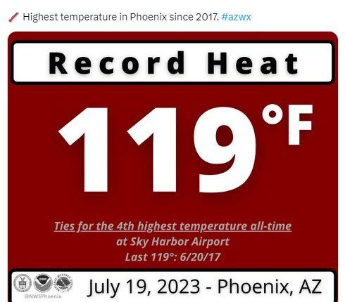 Por otro lado, Phoenix alcanzó el 19 de julio de 2023 los 119 grados Fahrenheit -48.3 grados Celsius-. Se trata de la temperatura más alta detectada en la ciudad y no se registraba desde 2017, según el Servicio Nacional de Meteorología.